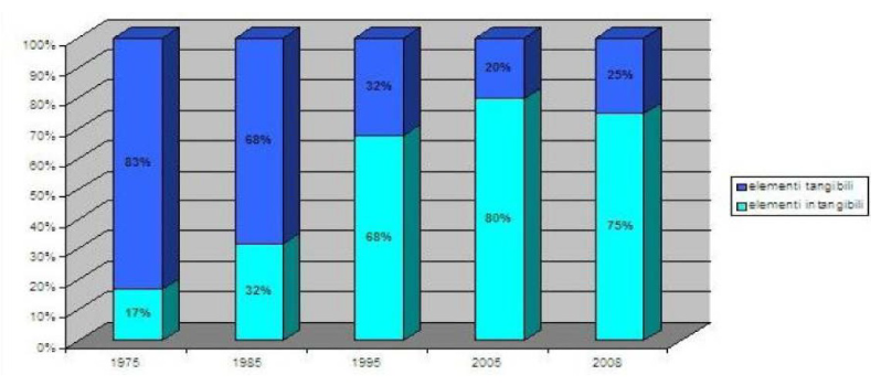 Il grafico, riportato da Ocean Tomo ed elaborato sulla base di un campione di 200 imprese quotate in tutto il mondo, mostra come negli ultimi 30 anni i beni intangibili hanno acquisito sempre maggior valore economico e strategico. Se negli anni '70 i beni intangibili rappresentavano circa il 20% del valore di mercato una impresa, oggi questi ne rappresentano circa l'80%. Gli intangibili rappresentano quindi un'ingente fetta del valore di mercato di un'azienda e sono un fattore critico di successo per molte imprese, costituendo un elemento differenziante nel processo di acquisto. A partire dagli anni '90 il divario tra valore di mercato e valore contabile di un'impresa, misurato dall'indice "price to book value", è notevolmente aumentato, segnalando che il mercato continua ad attribuire all'impresa un valore superiore a quello contabile, evidentemente per merito delle attività immateriali. Il seguente grafico mostra il numero di domande di deposito di marchi presentate presso tutti gli uffici specializzati nel mondo dal 1884. Come si può evincere dal grafico il numero di domande di deposito e aumentato vertiginosamente nell'ultimo trentennio.