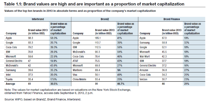 Nella tabella sottostante, presa dal “World Intellectual Property Report” del 2013 pubblicato dalla WIPO, sono riportate le classifiche dei 10 marchi con più valore al mondo e il loro relativo peso rispetto al valore totale dell'impresa. Come si può notare, le tre agenzie interrogate forniscono posizioni e valori diversi tra loro, a conferma di questa tendenza.